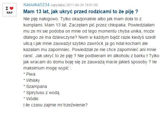 "Na naszej pierwszej wycieczce w gimnazjum piliśmy tylko i wyłącznie wódkę -tak zostało przegłosowane czego się obawiałem, bo już wtedy mając 13 lat miałem dwuletnie doświadczenie w piciu piwa — na początku po dwóch nie do końca wiedziałem co robię i mówię, ale później spokojnie mogłem wypić nawet 4 — na tym przeważnie kończyłem, bo starczało mi że było wesoło." Czytaj więcej