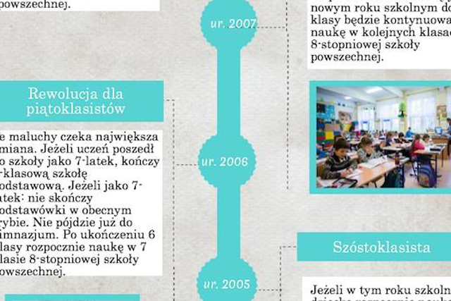 Rodzice maluchów uczących się w szkołach podstawowych już takimi entuzjastami nowego rozwiązania nie są. Głównie dlatego, że nie do końca wiedzą jak potoczy się szkolny los ich pociech. Pierwszy rocznik, który zostanie objęty reformą to uczniowie, którzy 1 września 2017 r. rozpoczną naukę w szkołach powszechnych, czyli tegoroczne sześciolatki oraz uczniowie, którzy powinni wówczas pójść do I klas gimnazjów (czyli ci, którzy w minionym roku chodzili do klas V szkół podstawowych), trafią oni do VII klas szkół powszechnych. Przygotowałyśmy grafikę ułatwiającą zrozumienie nadchodzących zmian.