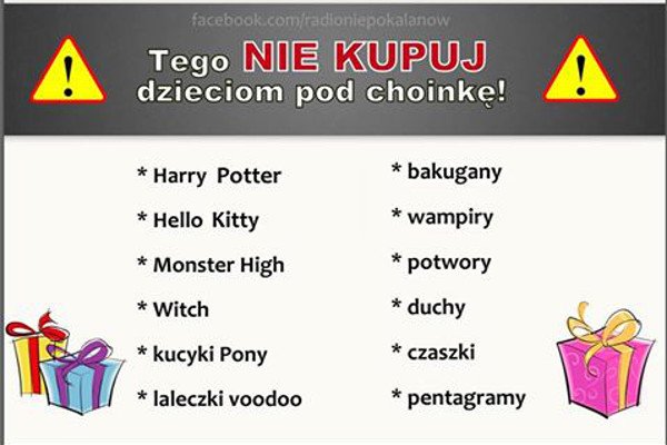 Nietypowe ostrzeżenie pojawiło się na Facebooku katolickiego radia. Jego autorzy na kilka dni przed Mikołajkami apelują o ochronę dziecięcych dusz, ale nie przez modlitwę, lecz... zaniechanie kupowania określonych zabawek.