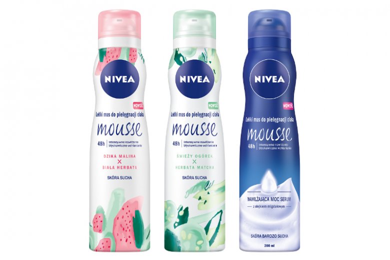 Niebiańsko rozpieszczające musy do pielęgnacji, które błyskawicznie się wchłaniają i zapewniają głębokie nawilżenie przez 48 godzin. W trzech wariantach zapachowych: pianka NIVEA Mousse z olejkiem migdałowym o klasycznym zapachu jest idealna dla skóry bardzo suchej oraz wszystkich kobiet, które lubią delikatne aromaty kojarzące się z pielęgnacją i ciepłem. Dla tych, którzy wolą świeże i ekscytujące owocowe nuty zapachowe NIVEA proponuje musy o zapachu Dzika Malina i Biała Herbata lub Świeży Ogórek i Herbata Matcha.