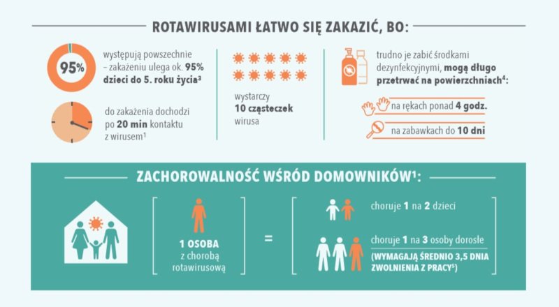 Jest kilka powodów, dla których infekcje rotawirusowe tak łatwo się rozprzestrzeniają. Po pierwsze, do zakażenia wystarczy niewiele, bo zaledwie 10-100 cząsteczek wirusa – dla porównania, w jednym stolcu biegunkowym są tych cząsteczek miliardy! Po drugie, rotawirusy są bardzo oporne na standardowe środki odkażające i niesprzyjające warunki środowiskowe. W efekcie potrafią nawet do 4 godzin utrzymać się na zanieczyszczonych dłoniach, a na powierzchniach (np. zabawek) nawet do 10 dni.