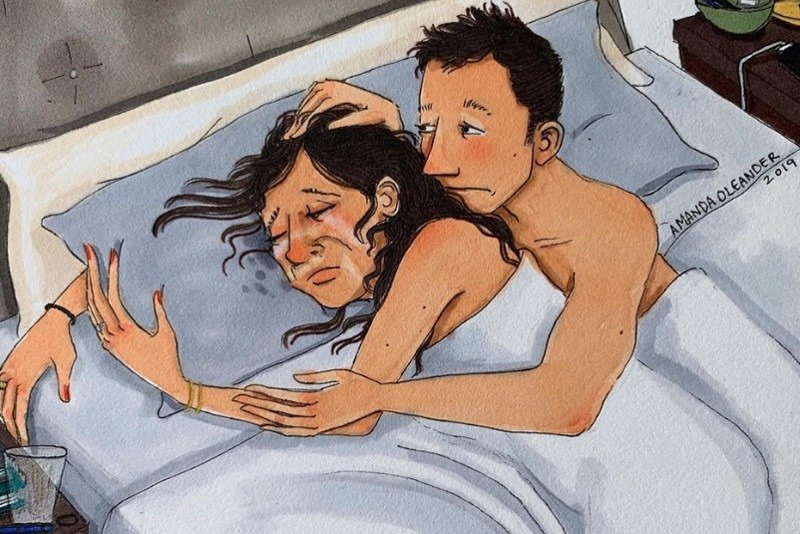 Znacie to? Na pewno! Chyba każdy z nas chociaż raz w życiu stał się ofiarą takiego wieczornego smutkowego napadu – z powodów wszelakich. Rysowniczka Amanda Oleander odniosła się w swoim rysunku do tego, co najpewniej w obecnych czasach dla wielu jest powodem złego nastroju – dosłownego, fizycznego oddalenia od najbliższych.