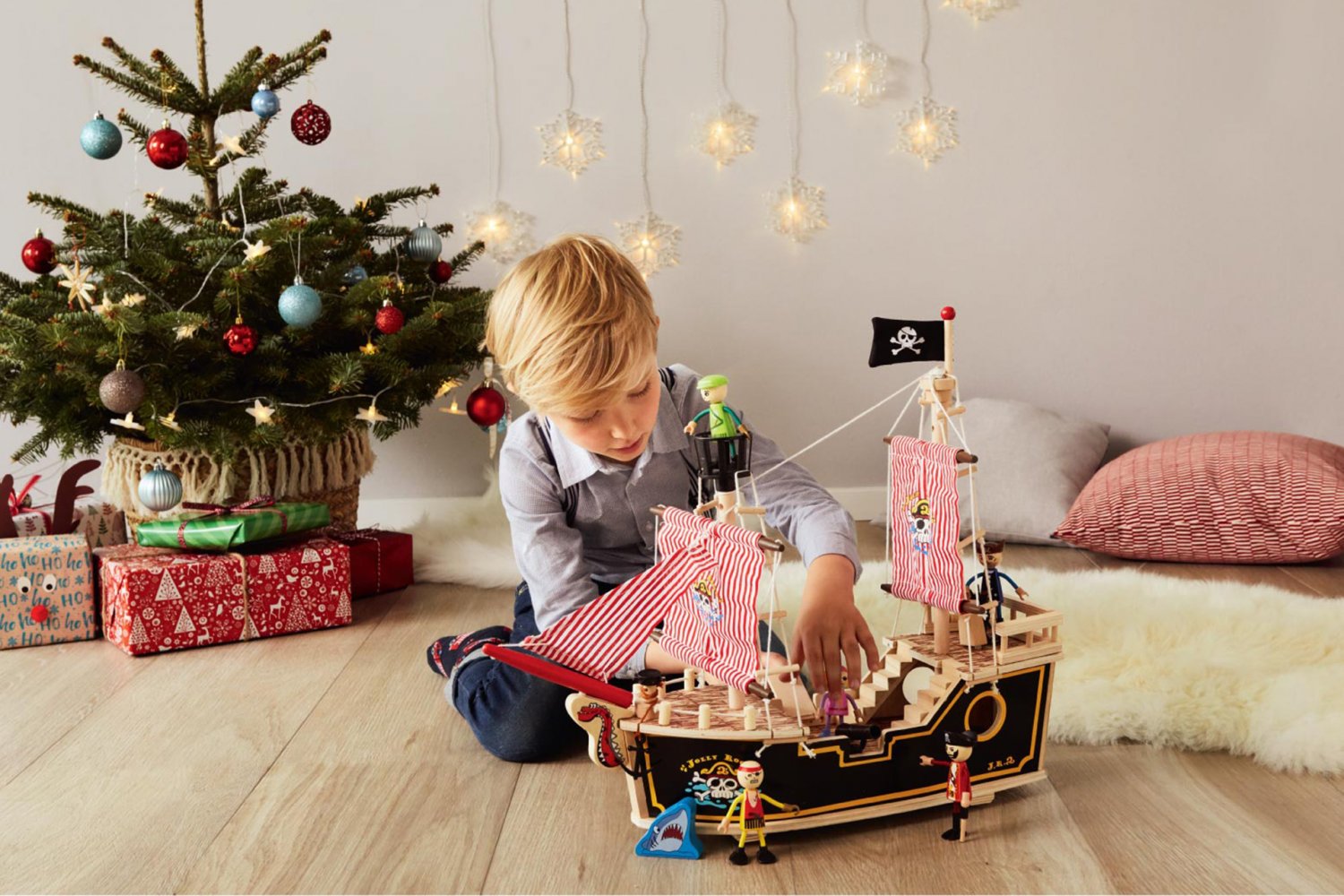 Pirackie motywy stały się, przez ostatnie dwie dekady, znów bardzo modne. Oferowany statek został oparty na niewidocznych, dobrze zakamuflowanych kółkach, dzięki czemu można śmiało nim sterować po wyobrażonych morzach i oceanach. W zestawie znajdziemy żagle, aż pięć figurek piratów, armatę z pięcioma kulami oraz inne szczegóły, które urozmaicą zabawę.
