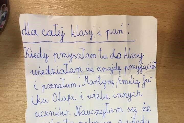 "Kiedy przyszłam tu do klasy, wiedziałam, że znajdę przyjaciół i poznałam (…) Nauczyłam się, że nauka to zabawa, a wtedy nawet pisanie, czytanie, dodawanie i mnożenie stało się fajne. Poznałam też panią Wiolę, panią Dominikę, a niedawno też panią Mirellę. Chciałabym zostać tu całe życie" - czytamy w liście.