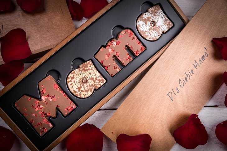 Czekoladowe litery mogą układać się też w napis “Mama”. Te dwie słodkie samogłoski i dwie spółgłoski są wykonywane ręcznie, przez mistrzów-czekoladników z najwyższej jakości czekolady, wraz z dodatkami takimi jak wiórki kokosowe, prażone migdały, suszone truskawki i wiele innych.Dodatkowo całość zapakowana zostanie w eleganckie, drewniane pudełeczko, które można ozdobić personalizowanym lub indywidualnym grawerem.