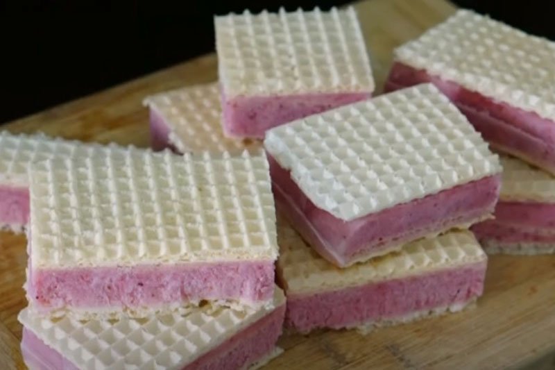 Po 4 godzinach wyjmuje i rozprowadza 10 ml mleka na górną część truskawkowej, zamrożonej masy. Na koniec dziecko przykrywa całość waflem i wkłada do zamrażarki na 10 minut. Po wyjęciu kroi jeden wielki lód na mniejsze, prostokątne kawałki i… już może cieszyć się smakiem dzieciństwa!