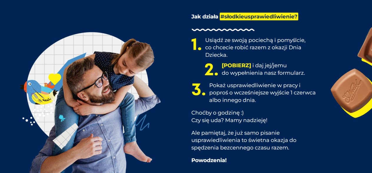 Słynąca z produkcji czekolad marka z okazji Dnia Dziecka przygotowała w tym roku akcję pod hasłem "Słodkie Usprawiedliwienie". Jak możesz wziąć w niej udział? Usiądź z dzieckiem i poświęć mu czas, aby wspólnie obmyślić, jak będziecie świętować "jego dzień". Następnie pobierz ze strony www.slodkieusprawiedliwienie.pl formularz i razem go wypełnijcie.