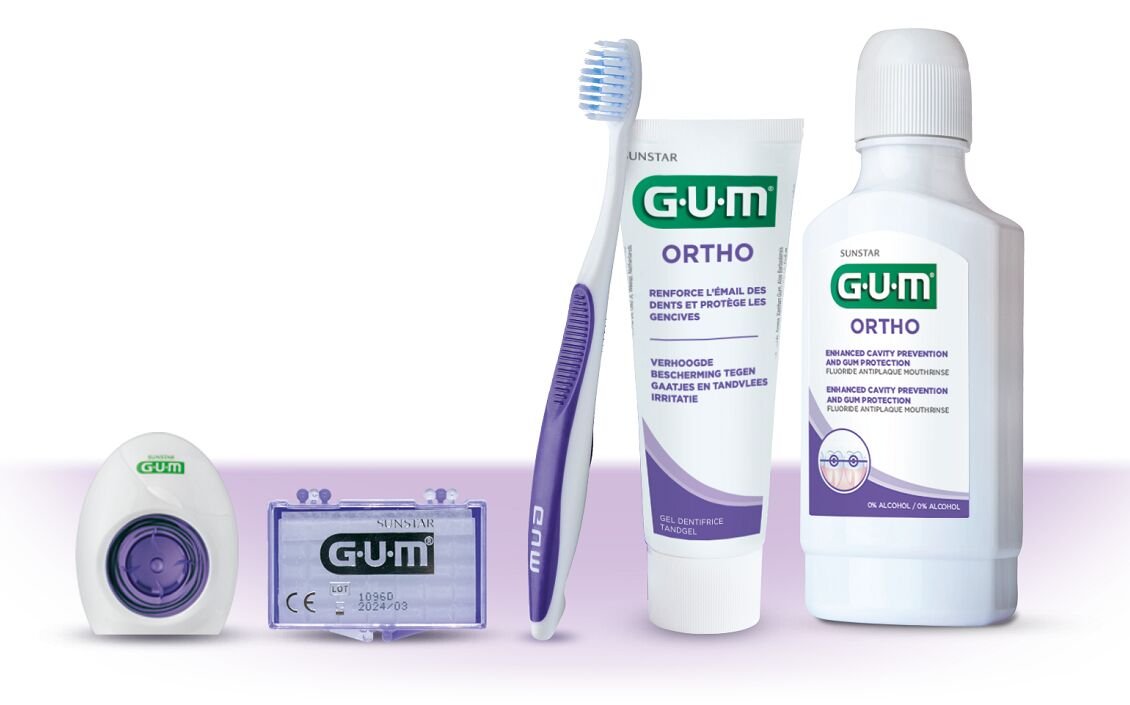 Linia produktów GUM® ORTHO to kompletny zestaw do higieny jamy ustnej skierowany do osób w trakcie leczenia ortodontycznego. Pasta do zębów dzięki żelowej konsystencji nie osadza się na aparacie i nie pozostawia grudek. W rodzinie produktów GUM® ORTHO dostępne są także dwie szczoteczki – klasyczna do użytku domowego oraz podróżna ze składaną rączką w formie etui. Obie posiadają włosie przycięte w kształt litery V, które pomaga w czyszczeniu elementów aparatu oraz miękkie włosie.