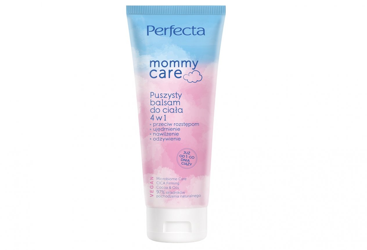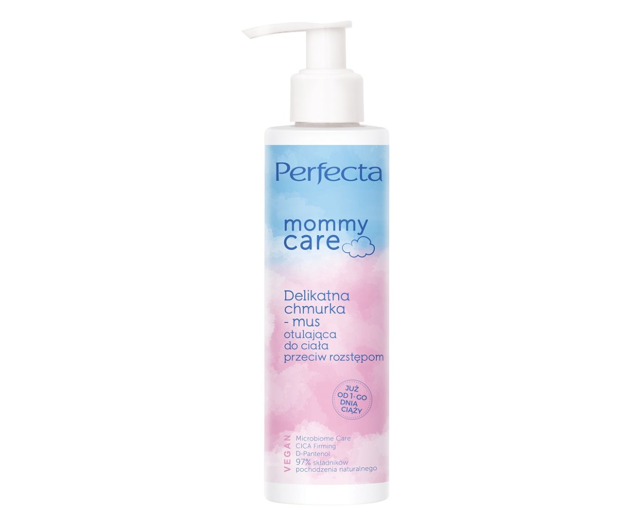 Perfecta Mommy Care to linia do kompleksowej pielęgnacji w czasie ciąży, w skład której wchodzą: Delikatna myjąca chmurka do higieny intymnej, Puszysty balsam do ciała 4w1 oraz Delikatna chmurka-mus otulająca do ciała przeciw rozstępom.
