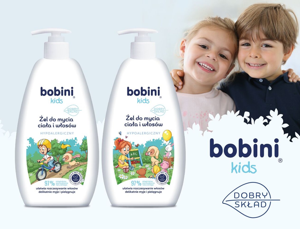 Bobini Kids Żel do mycia ciała i włosów to kosmetyk 2w1, który zapewnia dziecięcej skórze optymalną pielęgnację. Delikatnie myje ciało i włosy, sprawiając, że prysznic jest chwilą odprężenia dla malucha. Żel pozostawia skórę głowy nawilżoną i wygładzoną, a włoski miękkie i błyszczące. Produkt delikatnie się pieni, ułatwia rozczesywanie i łatwo się spłukuje. Nie powoduje łzawienia i nie podrażnia oczu.