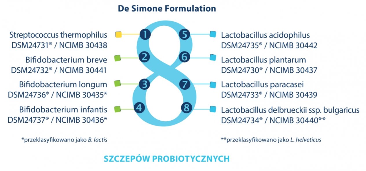 Probiotyki zawierają żywe kultury bakterii i inne mikroorganizmy wywierające korzystny wpływ na zdrowie. W aptekach można znaleźć np. preparaty zawierające unikalną mieszaninę 8 szczepów bakterii probiotycznych tzw. Oryginalną Formułę profesora De Simone (De Simone Formulation). Taki wieloszczepowy skład pozwala osiągnąć efekt synergii przewyższający sumę działań każdego składnika z osobna [9].