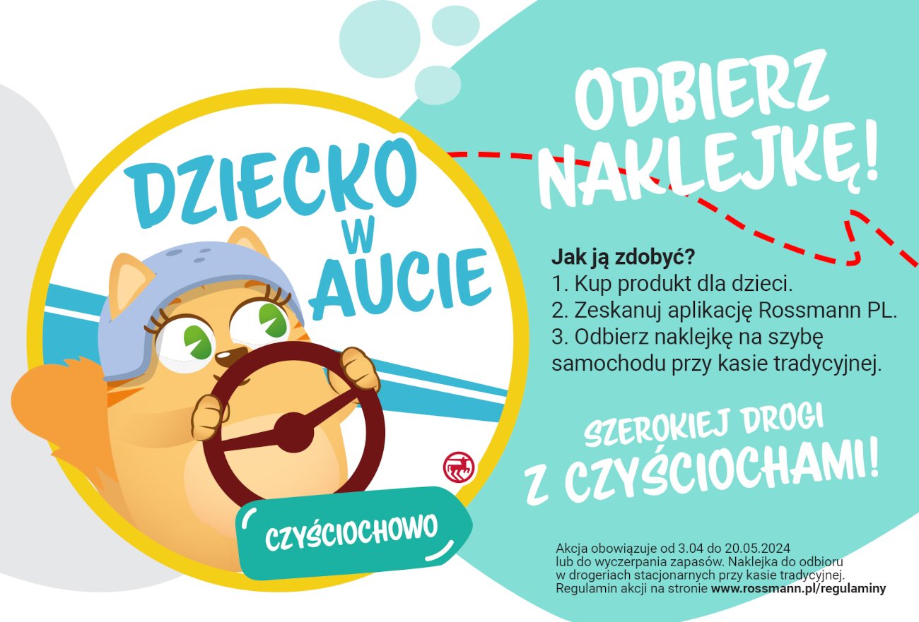 Od 3 kwietnia klienci Rossmanna mogą odebrać naklejkę na szybę samochodu. Upominek z bohaterami Czyściochowa ma za zadanie poinformować pozostałych uczestników ruchu drogowego, że w pojeździe znajduje się dziecko. Jak zdobyć naklejki z Kotką Pupilką i Psem Łapsonem?