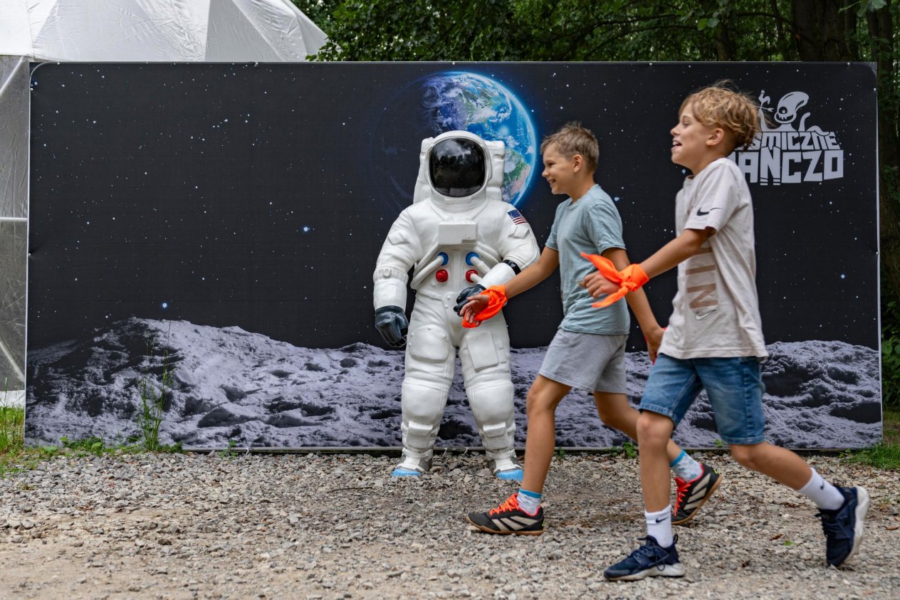 Dodatkowo, strefa kosmoZABAWY oferuje trzy place zabaw, dmuchańce oraz ogromną piaskownicę pełną czerwonego, marsjańskiego piasku. Dzieci mogą również bawić się w hangarze zabawy, który wyposażony jest w tunele, zjeżdżalnie, basen z piłeczkami i stanowisko do budowy konstrukcji z mega klocków.