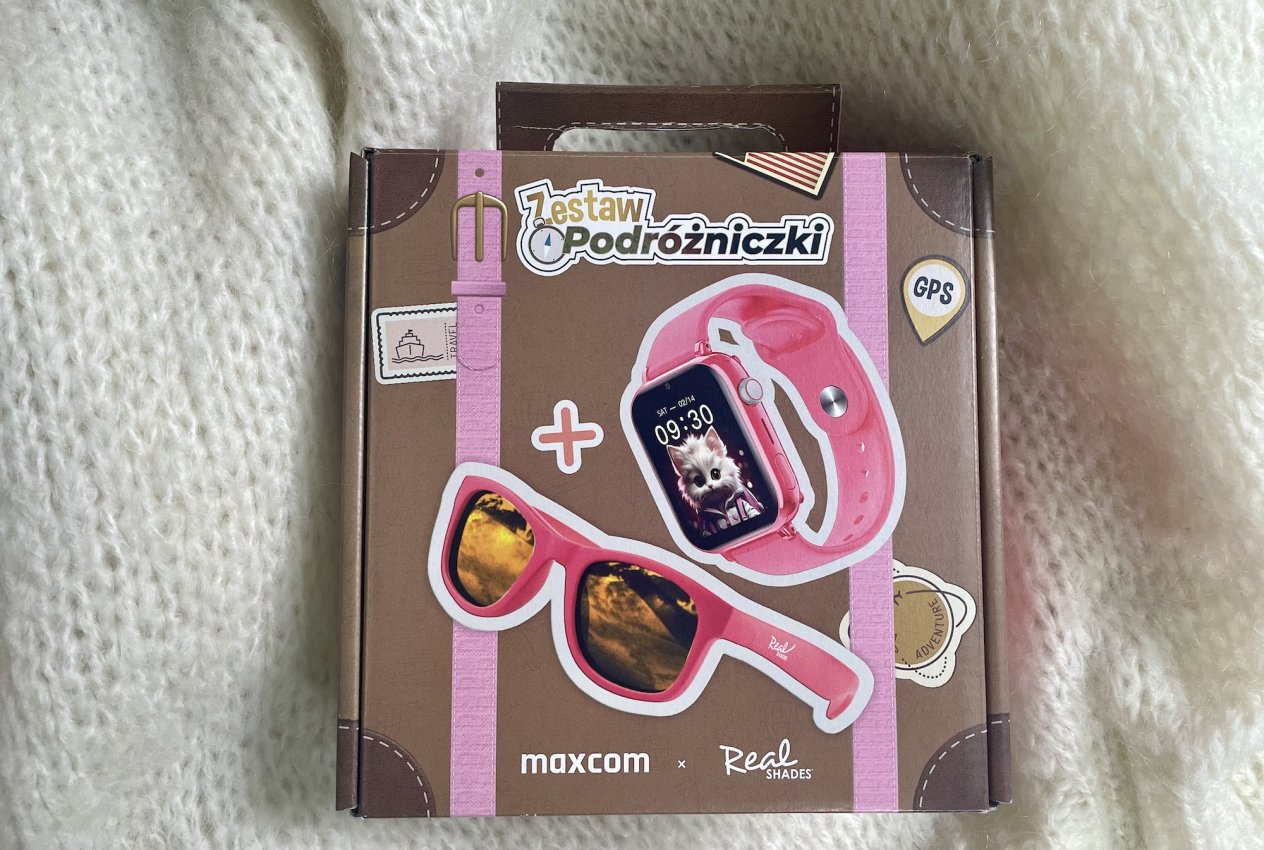 Wspomniałam, że zegarek jest dostępny w fantastycznej odsłonie podróżnej? W tekturowej mini walizce, z przepięknymi naklejkami, które skradły serce mojej córki i… z przeciwsłonecznymi okularami amerykańskiej marki Real Shades. Oczywiście, różowymi lub niebieskimi, dopasowanymi do konkretnych odcieni zegarka.