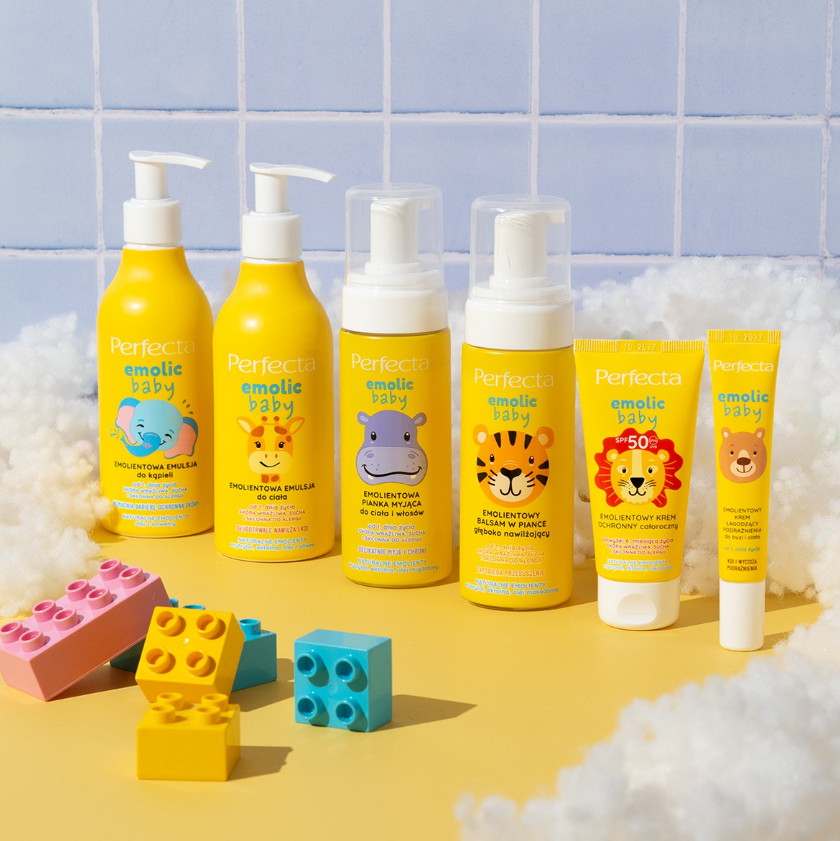 W serii Perfecta Emolic Baby znajdziemy aż sześć kosmetyków, czyli kompletny zestaw pielęgnacyjny dla każdego maluszka. Oto one: