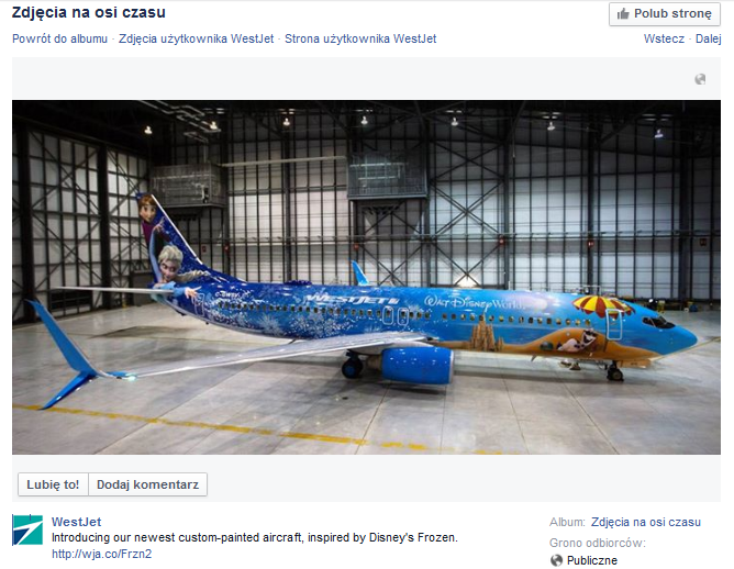 Linie West Jet postanowiły sprawić niespodziankę wszystkim fanom filmu Disney' a - zatrudniona przez nie międzynarodowa załoga przemieniła jeden z samolotów w lodową, magiczną wręcz maszynę latającą. Przed rozpoczęciem pracy wszyscy członkowie ekipy obowiązkowo zapoznali się z filmem "Kraina Lodu" i jego bohaterami. 643,5 litrów farby w 23 kolorach i trzy tygodnie pracy 24 godziny na dobę dają naprawdę olśniewający efekt.