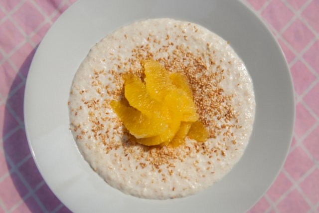 Owsianka napełnia, rozgrzewa, przywołuje smaki dzieciństwa. Wielowymiarowa i prosta jak, jak zrobienie sobie herbaty. Dla mnie nieoceniona zimą, szczególnie z tymi dodatkami. Słodka biała czekolada, lekko kwaśna pomarańcza i chrupiący prażony sezam.