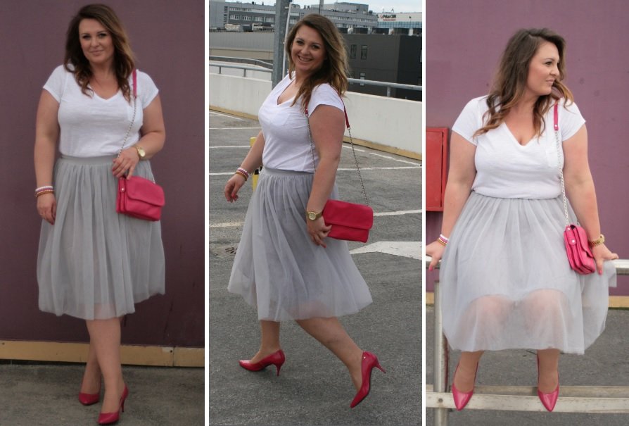 Do szarej spódnicy wybrałam zwykły biały T-shirt z dekoltem z Marks and Spencer. Tiulowa spódnica super się komponuje ze zwykłymi topami, które sprowadzają na ziemię cały look. ;) Do bardzo klasycznych i stonowanych kolorów, wybrałam różowe dodatki. Buty są świeżo kupione na przecenie w sklepie Venezia, za 229zł. Ten sklep to super opcja dla wysokich kobiet z dużym rozmiarem stopy, bo jest niski obcas i rozmiarówka do 41.