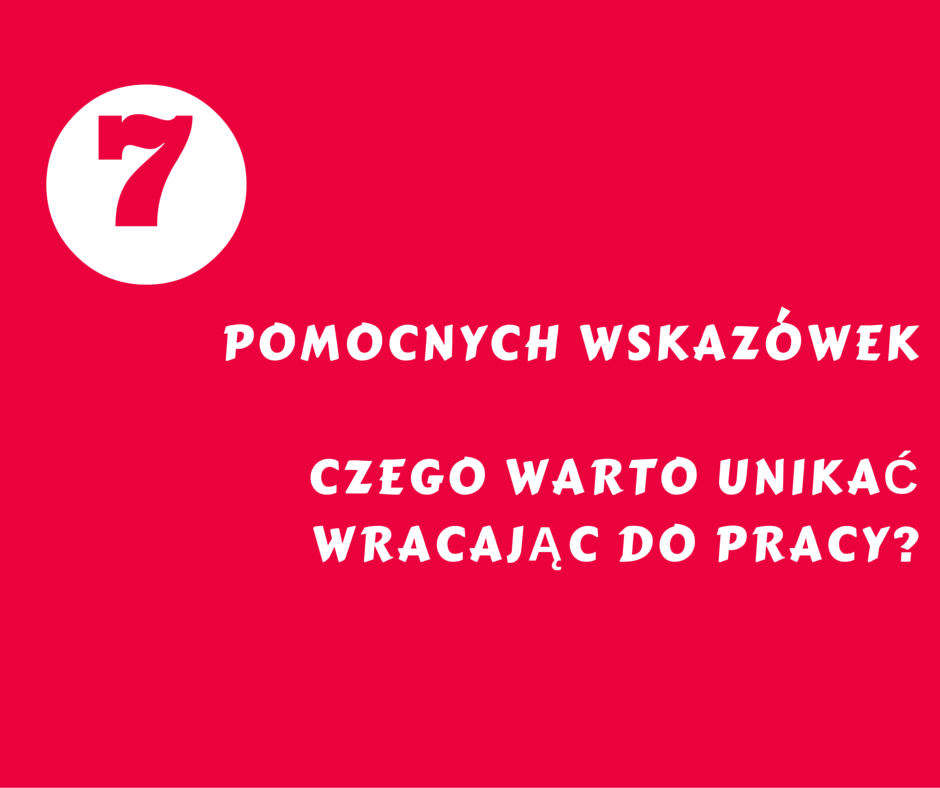 Pracodawca nie boi się twojego powrotu do pracy, dopóki ty nie zarazisz go swoimi lękami. Twórz rozwiązania, które ci pomogą i proponuj pracodawcy, aby się w nie włączył pokazując mu korzyści dla twojej pracy i dla firmy.