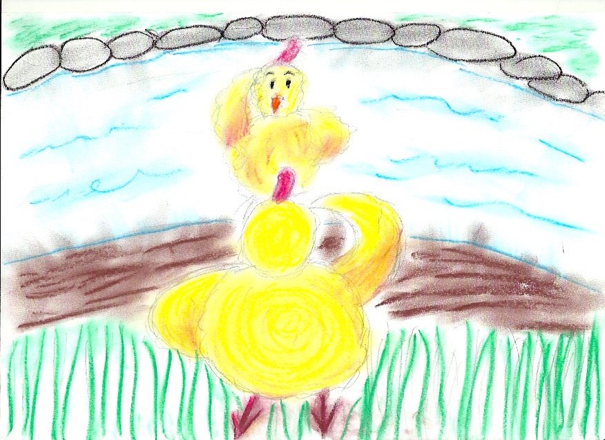 Ksawerek nigdy wcześniej nie widział strumienia. Nachylił się nad taflą, by zanurzyć dziobek w wodzie i … zobaczył tam drugiego kurczaka!