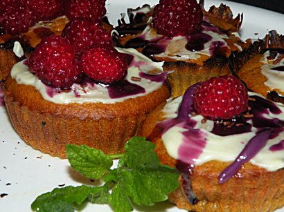 6. Babeczki smarujemy białą polewą i układamy maliny. Całość skrapiamy fioletowym lukrem.