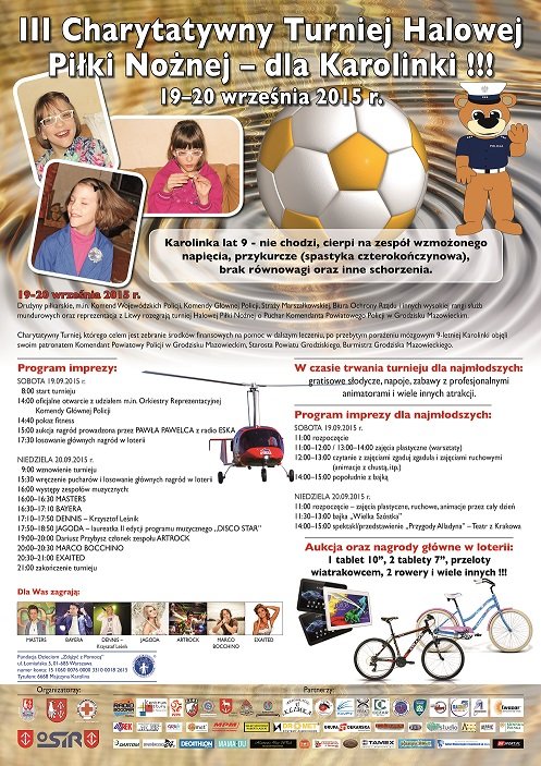 Tym razem środki finansowe zebrane w czasie trwania dwudniowego turnieju zostaną przeznaczone na pomoc w leczeniu 9-letniej Karolinki – mieszkanki naszego powiatu i podopiecznej Fundacji „Zdążyć z Pomocą”. W tegorocznym turnieju udział weźmie 18 reprezentacji służb resortu Ministerstwa Spraw Wewnętrznych oraz Obrony Narodowej, a nawet drużyna z Litwy. Honorowy patronat nad tym przedsięwzięciem objął Komendant Powiatowy Policji w Grodzisku Mazowieckim oraz Starosta Powiatu Grodziskiego i Burmistrz Grodziska Mazowieckiego. Organizację turnieju będzie wspierać także wiele instytucji i osób prywatnych.