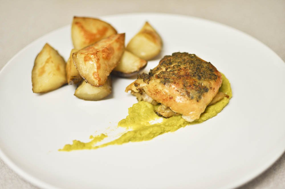 Ząbek czosnku sparzyć przez ok 4 minuty, następnie zblendować razem z groszkiem, oliwą i miętą na jednolite pure. Odstawić do lodówki.