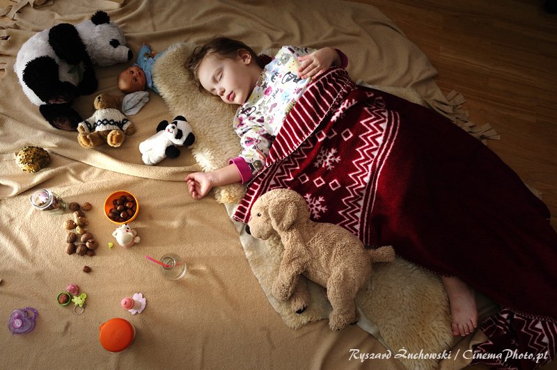 Gdy pewnego dnia nie przerwałem pracy przy komputerze i nie podjąłem wieczornej lektury, Marysia powoli, spokojnie rozłożyła na środku pokoju kocyk, potem ułożyła zabawki, pluszaki i kilka innych niezbędnych rzeczy, a na koniec stwierdziła: "Idę spać z moimi przyjaciółmi". Dodam że miejsce tego wieczornego pikniku było tuż obok mnie. Tym razem wystarczyła moja obecność.