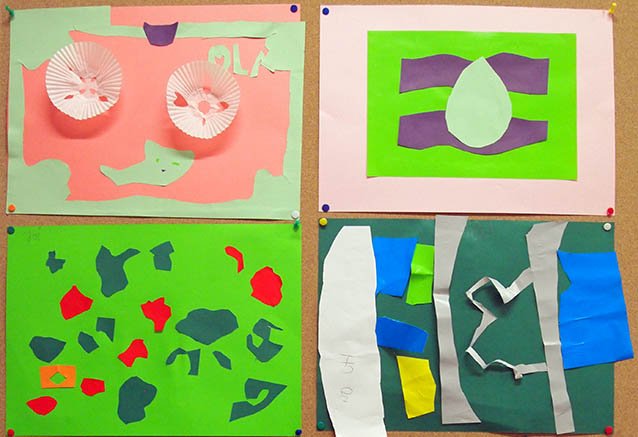 Opowiedziałam im o twórczości Henri’ego Matisse i pokazałam film prezentujący jego piękne wycinanki, a także krótkie video z samym mistrzem tworzącym kolaż. A później dzieci zabrały się do malowania nożyczkami. Każdy wybrał sobie kolor tła i na nie naklejał wycięte przez siebie kształty i powstały takie piękne pełne kolorów prace: