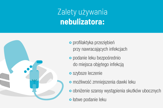 Nebulizacja wspiera leczenie infekcji górnych oraz dolnych dróg oddechowych – to znaczy, że możemy ją stosować w przypadku takich chorób, jak na przykład przeziębienie, zapalenie płuc, oskrzeli, krtani czy też katar. Nebulizator służy do precyzyjnego podania leku bezpośrednio do dróg oddechowych – tym samym przyspieszając ich wchłanianie i działanie terapeutyczne. W przypadku gdy dziecko często choruje, w ramach profilaktyki przeziębienia zamiast leku można użyć roztworu soli fizjologicznej, która jest bezpieczna dla malucha i wykazuje silne działanie antyseptyczne. Regularne stosowanie nebulizatora nawilża błony śluzowe nosa i gardła, likwiduje również pierwsze objawy przeziębienia, nie dopuszczając do rozwinięcia się choroby.