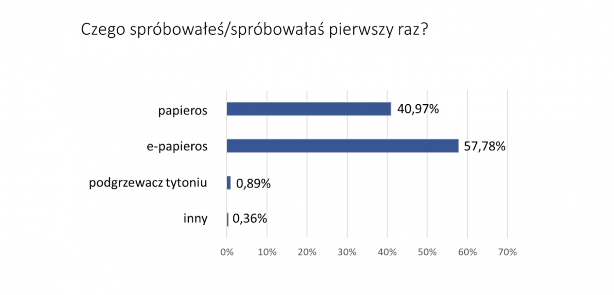 To właśnie e-papierosy, szczególnie te jednorazowe o smaku słodyczy czy owoców, są pierwszym produktem nikotynowym, po który sięgają nastolatki. Aż 75 proc. uczniów przyznaje, że po raz pierwszy sięgnęło po produkt z nikotyną przed ukończeniem 15. roku życia – najczęściej właśnie po e-papierosa (58 proc.), na drugim miejscu uplasowały się tradycyjne papierosy (prawie 41 proc.).