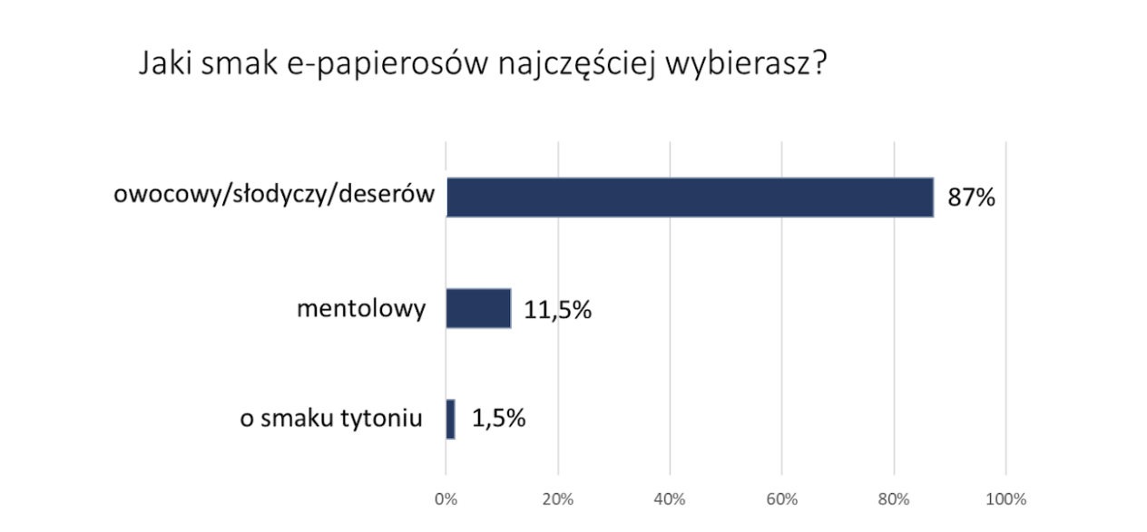 Aż 78 proc. uczniów szkół średnich w wieku 16-17 lat wapuje e-papierosy regularnie. Zdecydowana większość z nich wybiera te o smakach owoców lub słodyczy. Po papierosy tradycyjne sięga mniej nastolatków – przyznaje się do tego 24 proc. z nich. Jeszcze mniej, bo zaledwie 7 proc., używa podgrzewaczy tytoniu. Do codziennego używania wyrobów z nikotyną przyznaje się co trzeci uczeń (31,1 proc.).
